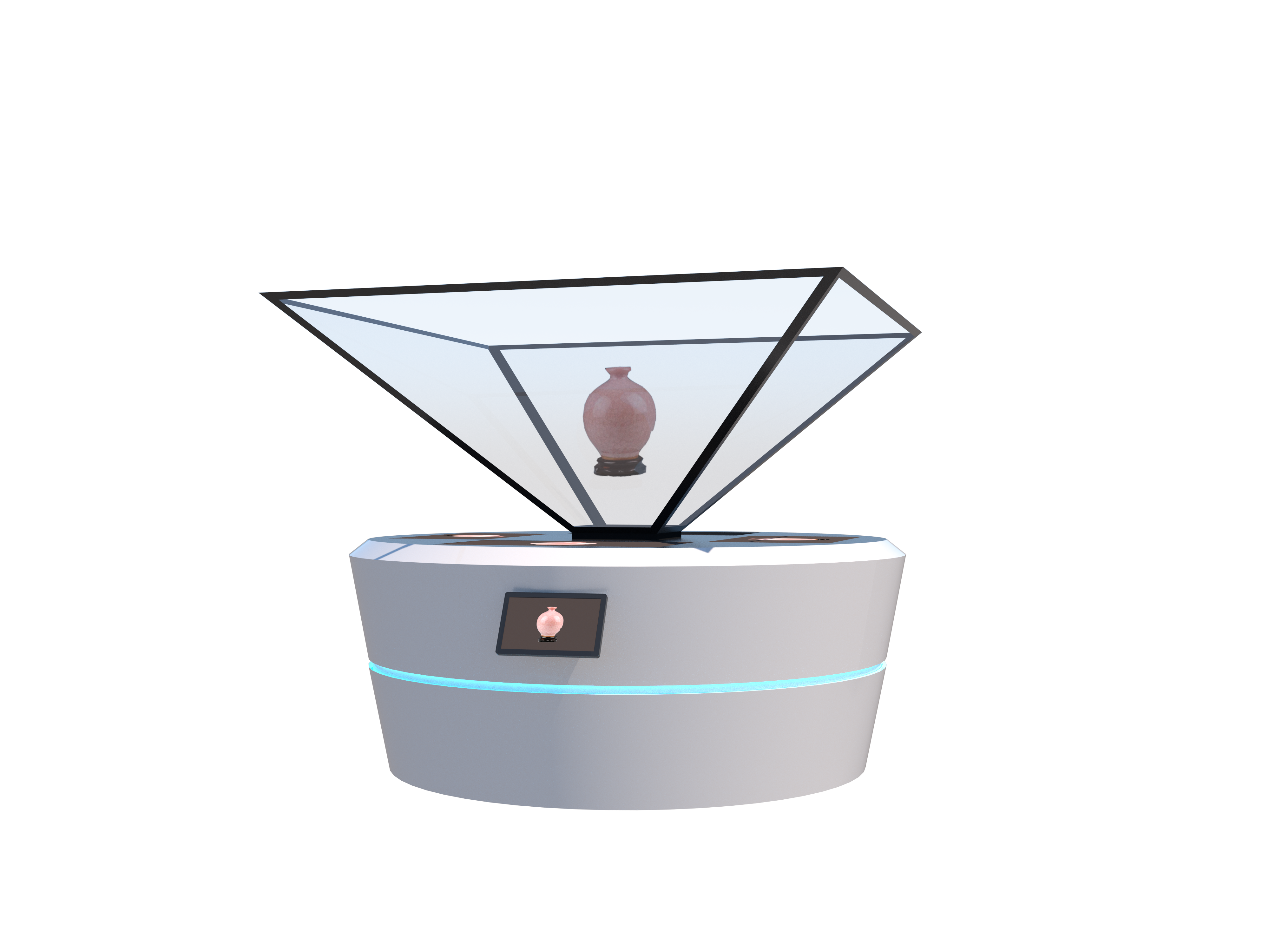 360度幻影成像系统也称为虚拟成像系统,将三维画面悬浮在实景的半空中成像,营造了亦幻亦真的氛围,效果奇特,具有强烈的纵深感,真假难辩。柜体时尚美观,有科技感。顶端四面透明,真正的空间成像色彩鲜艳,对比度,清晰度高;有空间感,透视感。形成空中幻象中间可结合实物,实现影像与实物的结合。也可配加触摸屏实现与观众的互动
